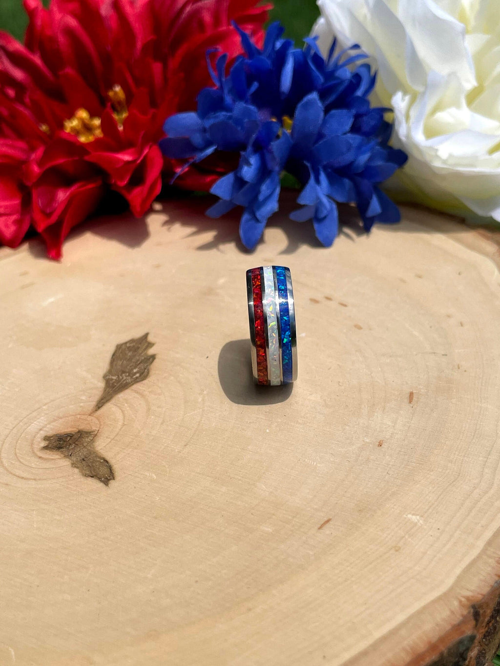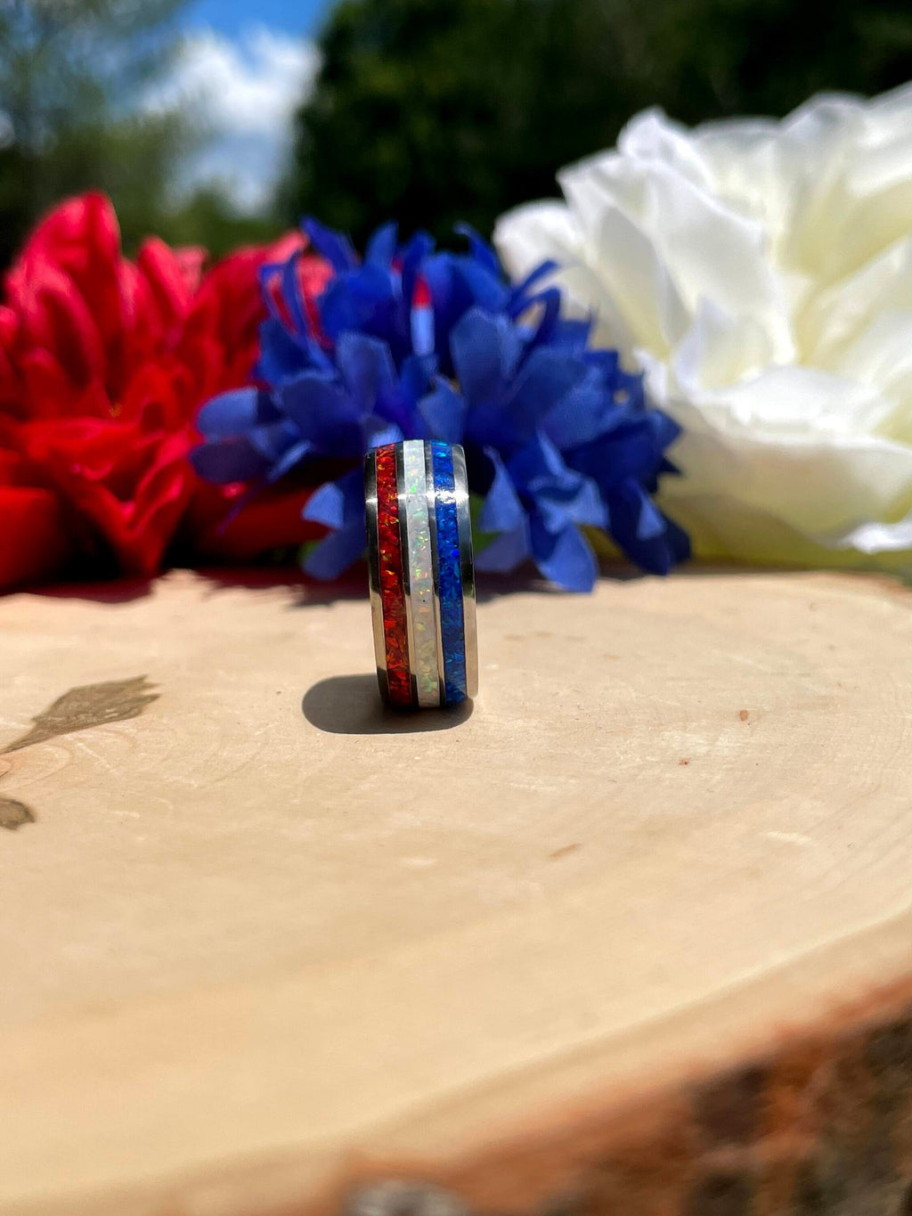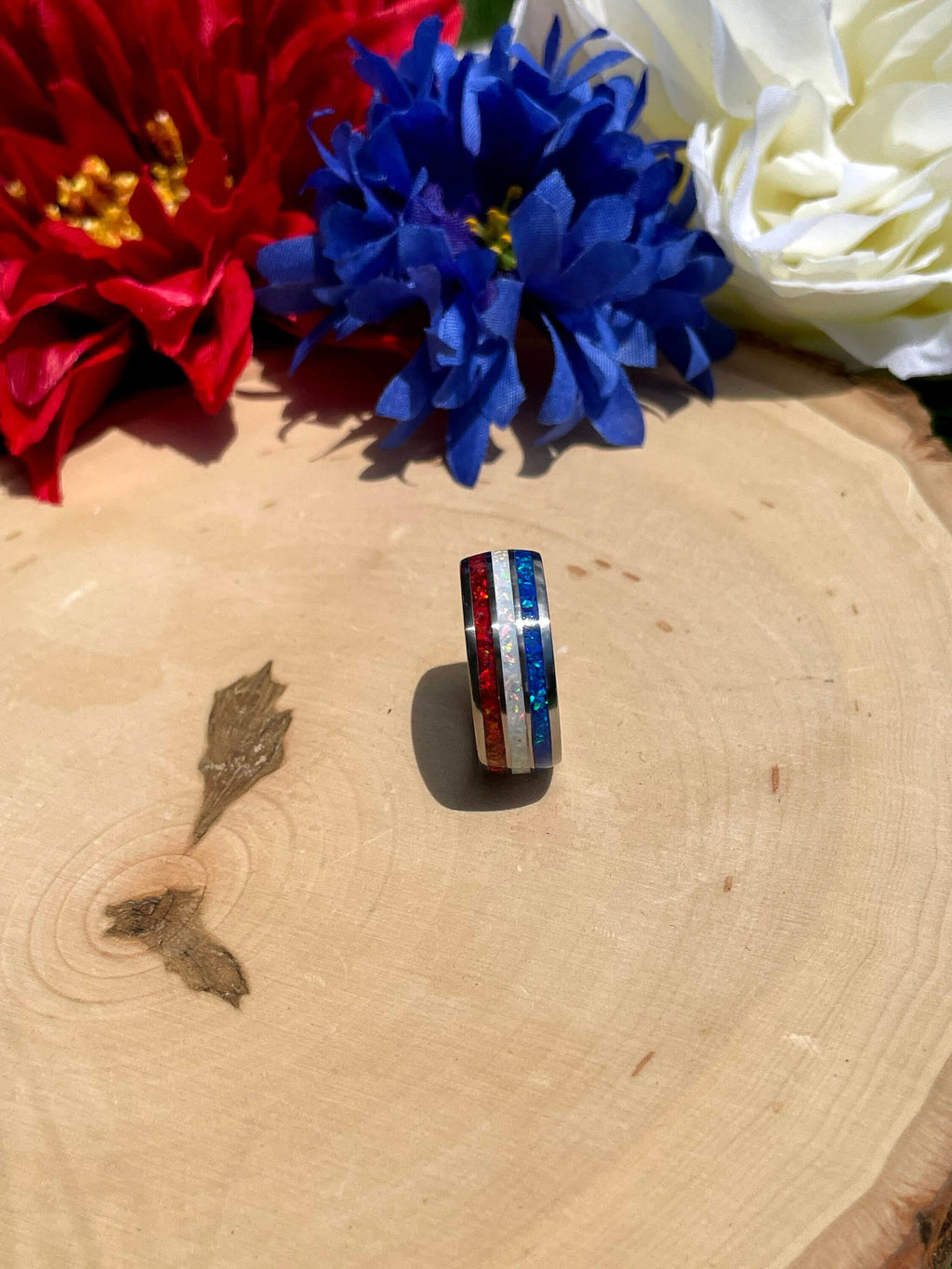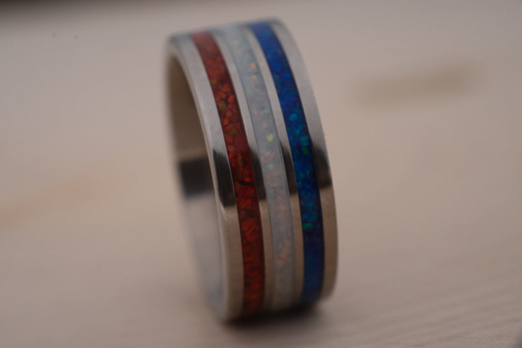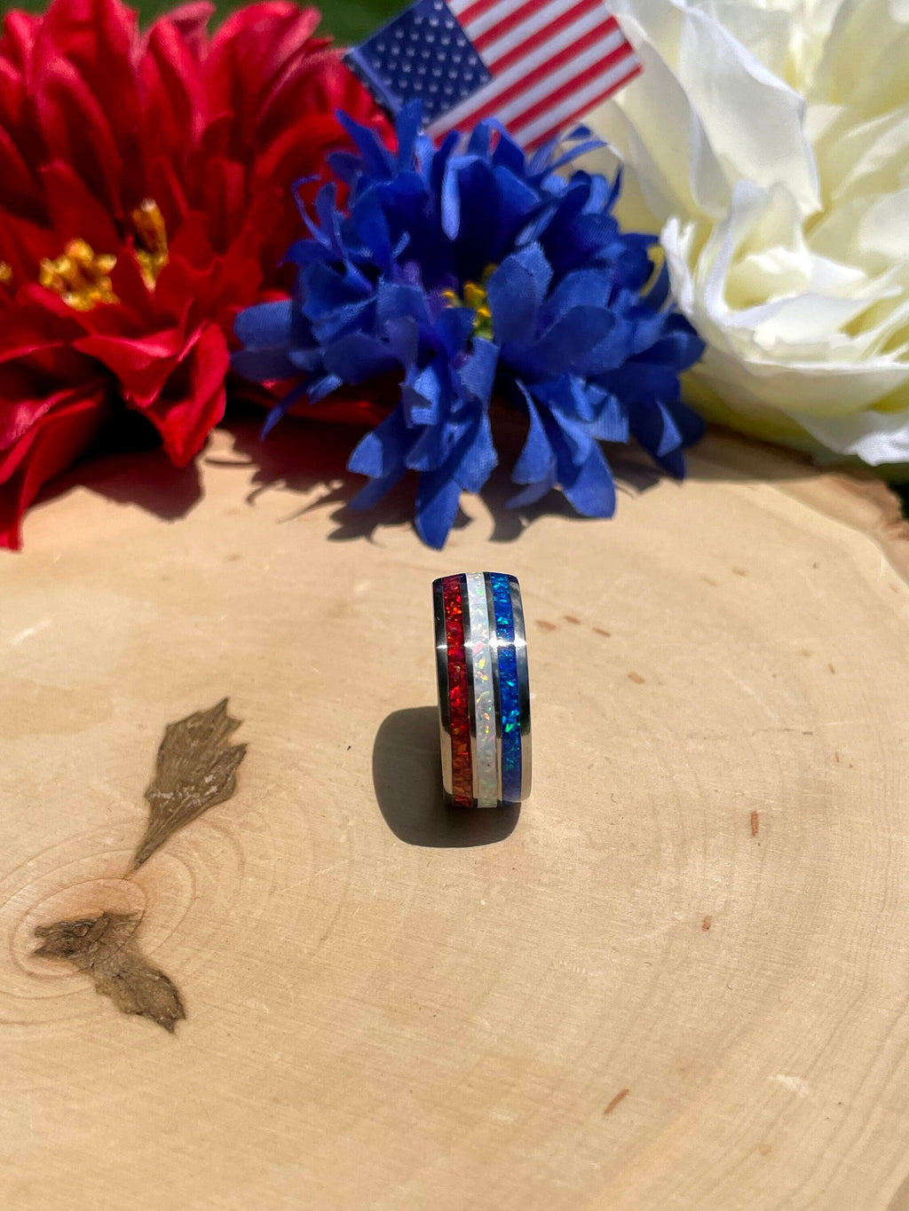 Three channel opal ring inlayed with red, white, and blue opal colors into extremely durable black ceramic or titanium. Each ring is lovingly handmade to order for men and women. This ring ships free to anywhere in the US