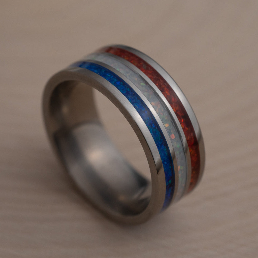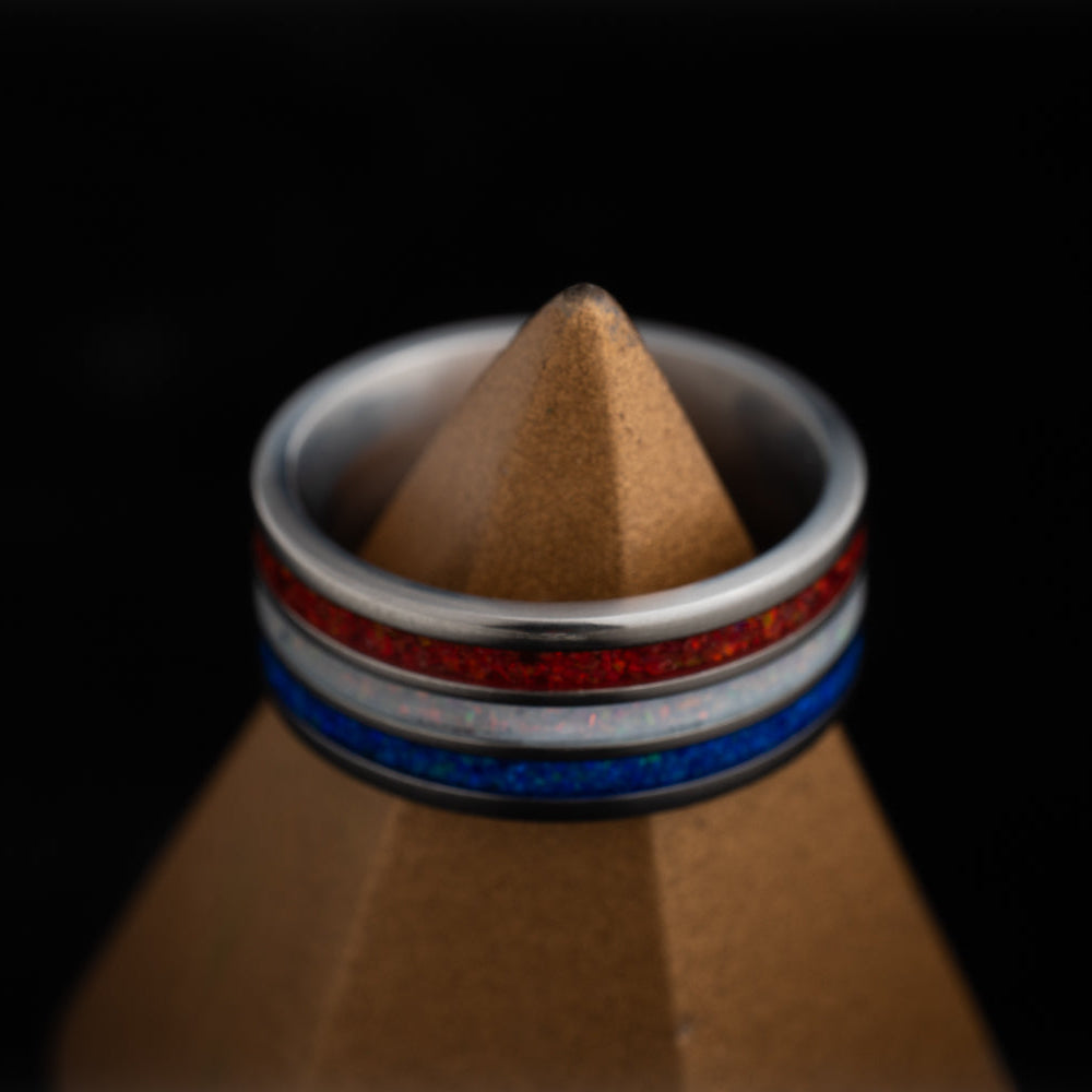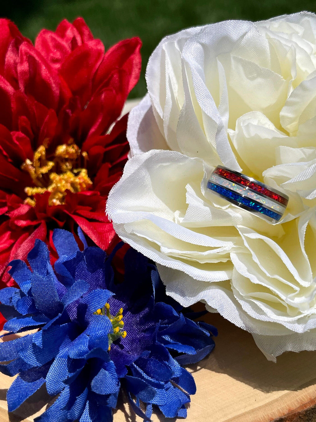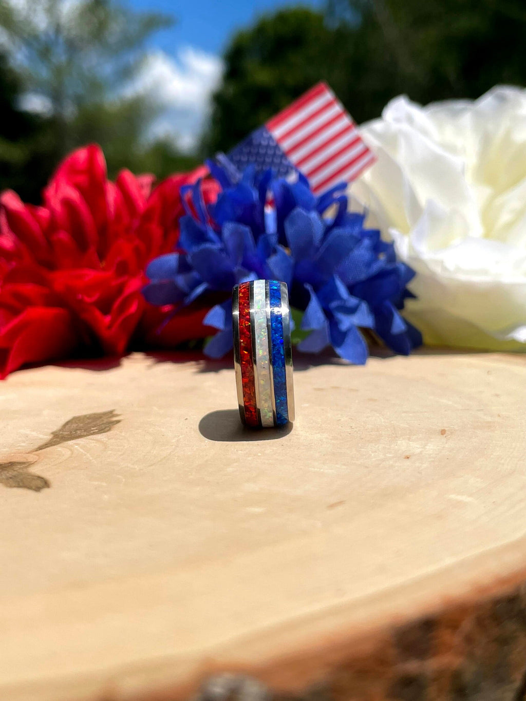 Three channel opal ring inlayed with red, white, and blue opal colors into extremely durable black ceramic or titanium. Each ring is lovingly handmade to order for men and women. This ring ships free to anywhere in the US