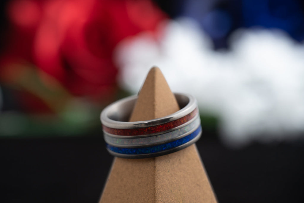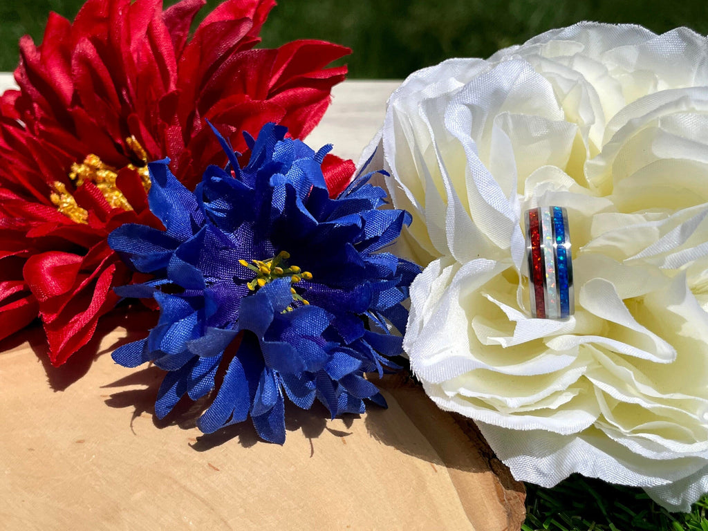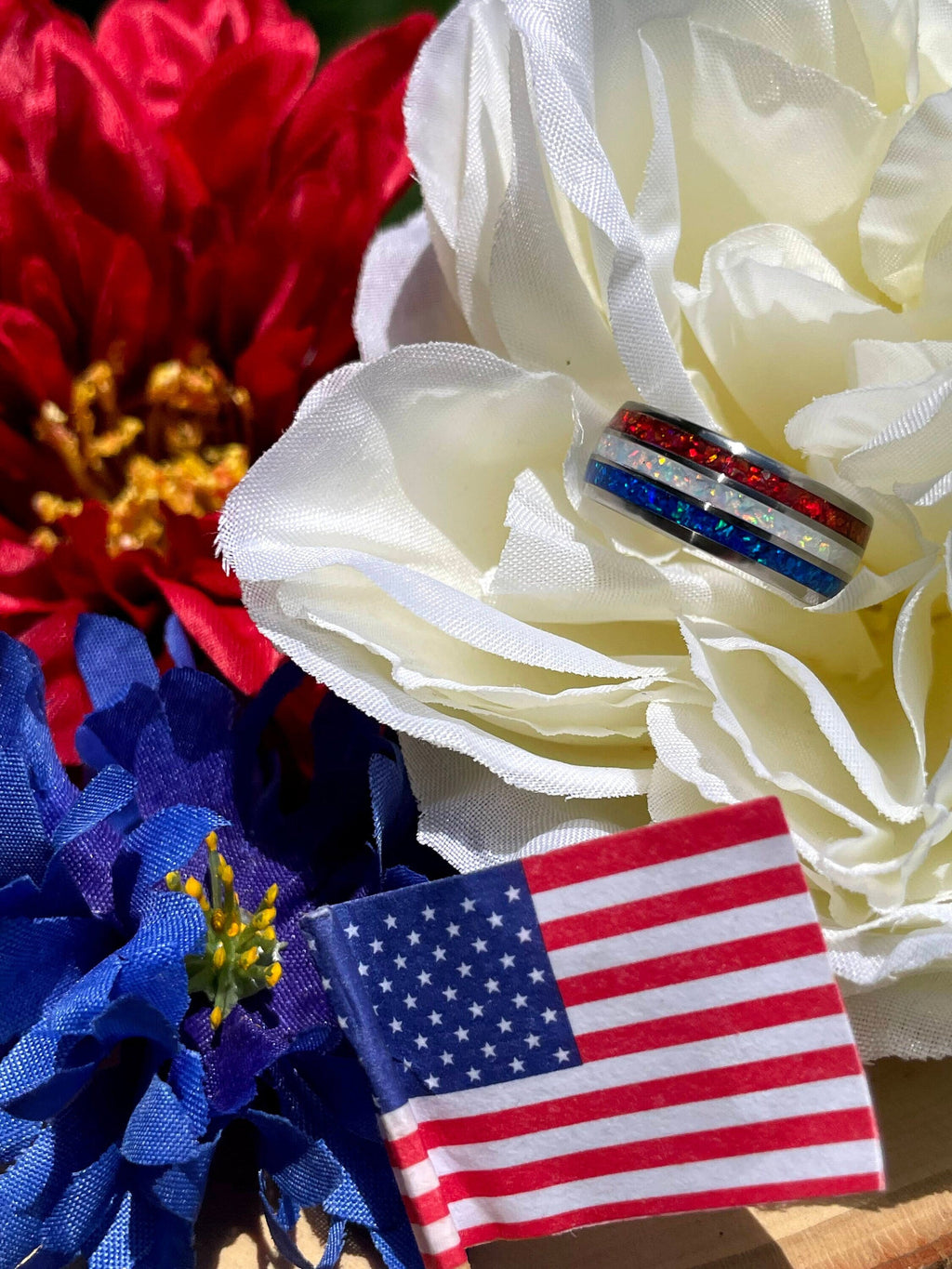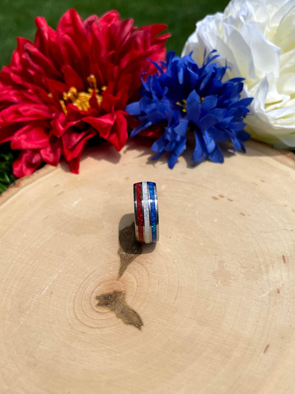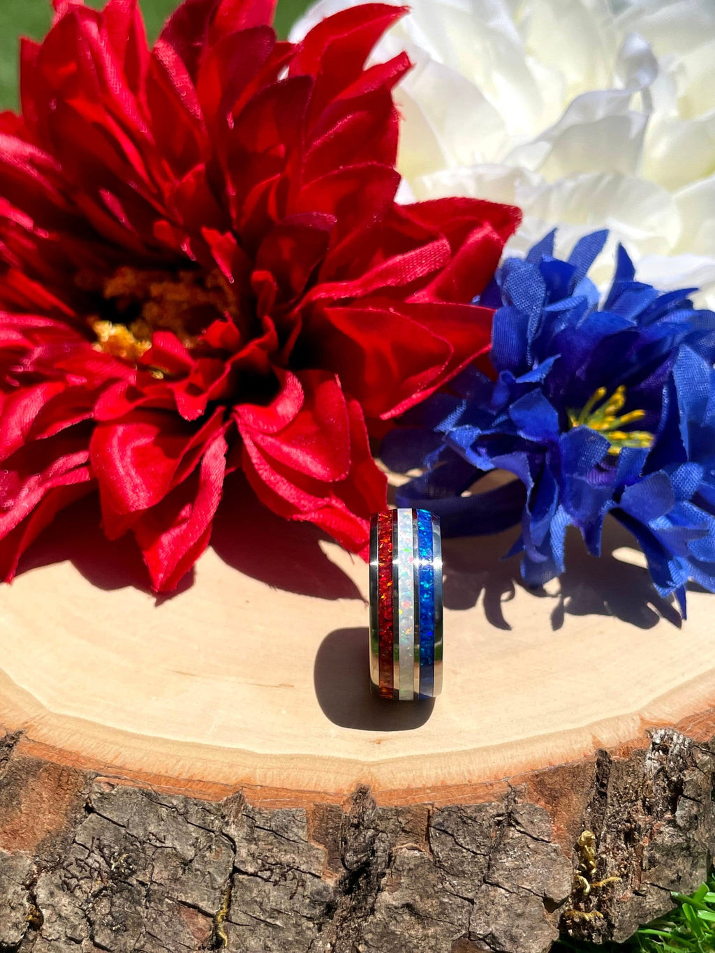 Three channel opal ring inlayed with red, white, and blue opal colors into extremely durable black ceramic or titanium. Each ring is lovingly handmade to order for men and women. This ring ships free to anywhere in the US