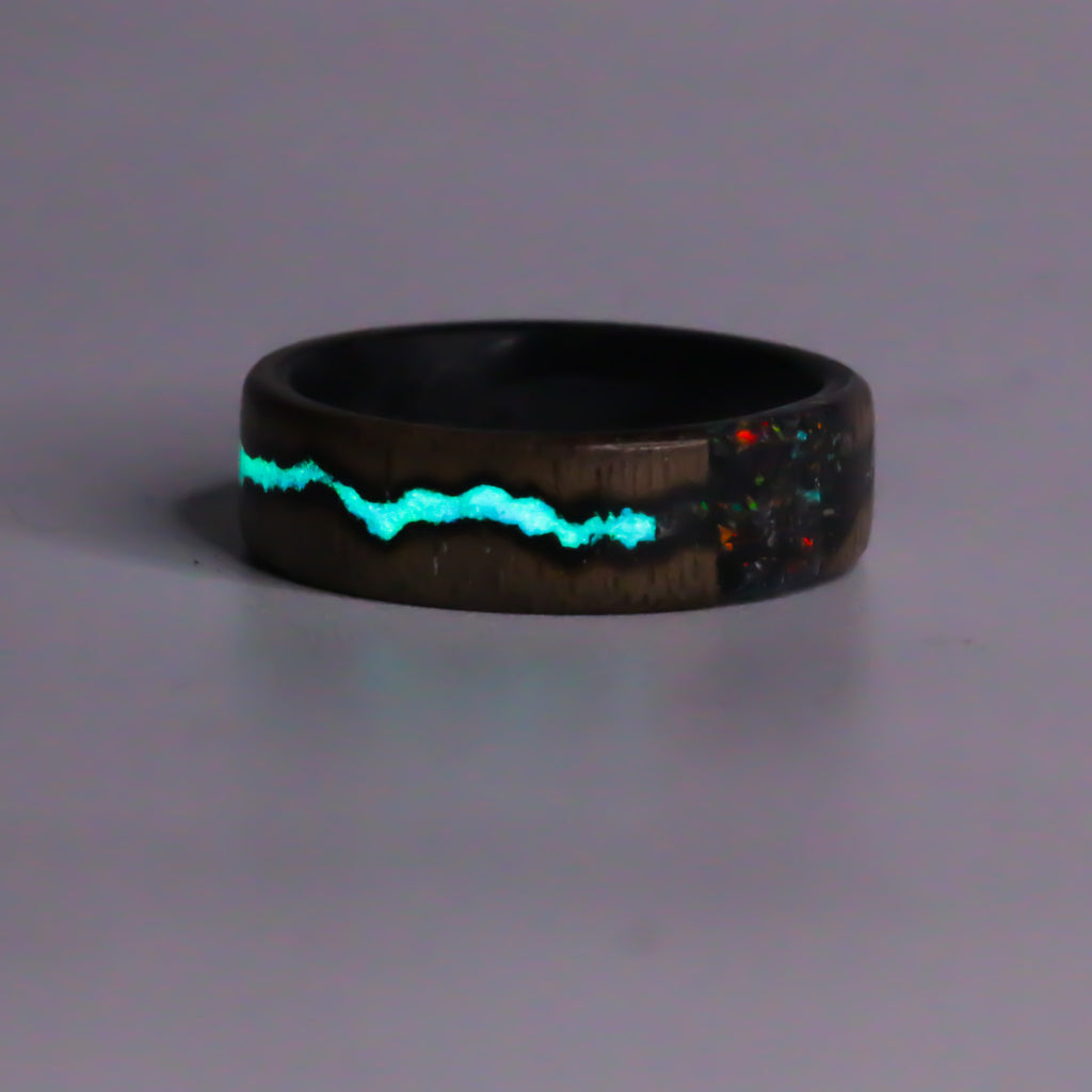 Here's a quick video that shows what goes into making our rings. We hand craft each ring in house made specifically for you. We use the highest grade carbon fiber, ultra pure epoxy that has been cured and post cured for maximum strength, super bright glow and high grade materials across the board.