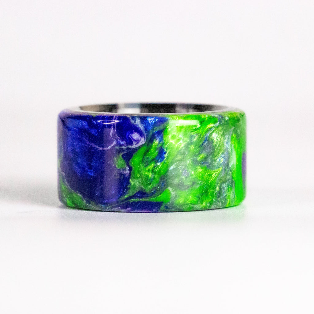 Made with brilliantly beautiful and pearlescent mica pigments hand mixed into a killer combination composite and seated on durable, hypoallergenic and lightweight titanium. This ring design is intense, beautiful and jaw dropping. If someone doesn't notice this ring, they need to see an eye doctor ASAP.