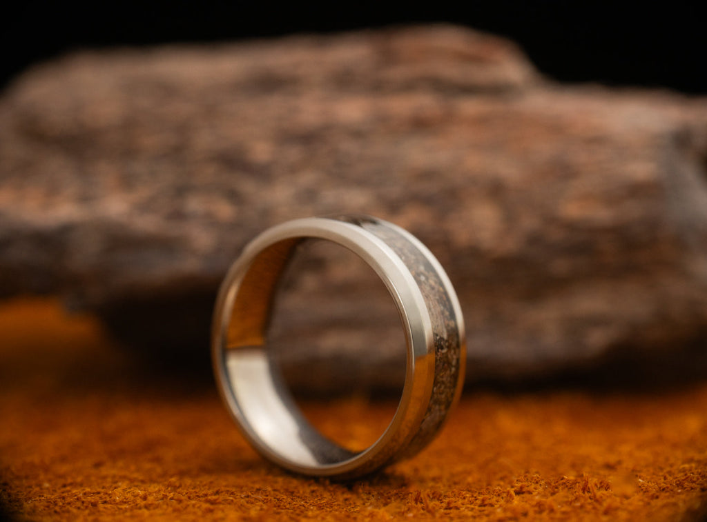 This ring bears the roar of the earth’s untamed past. Its inlay of fossilized dinosaur bone thrums with the echo of a world ruled by giants—ferocious, unrelenting, and wild. A monument to life that once thundered across the land.