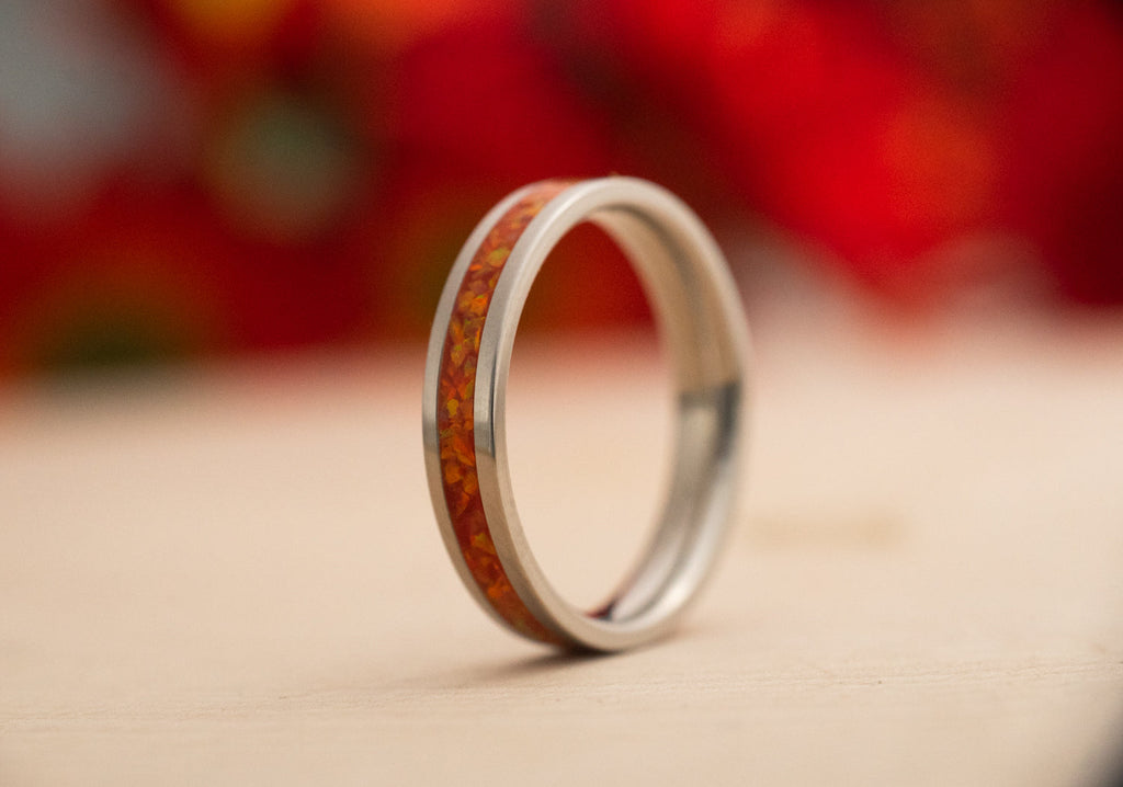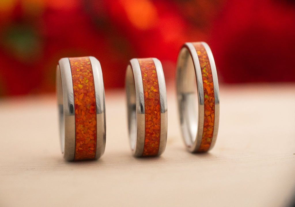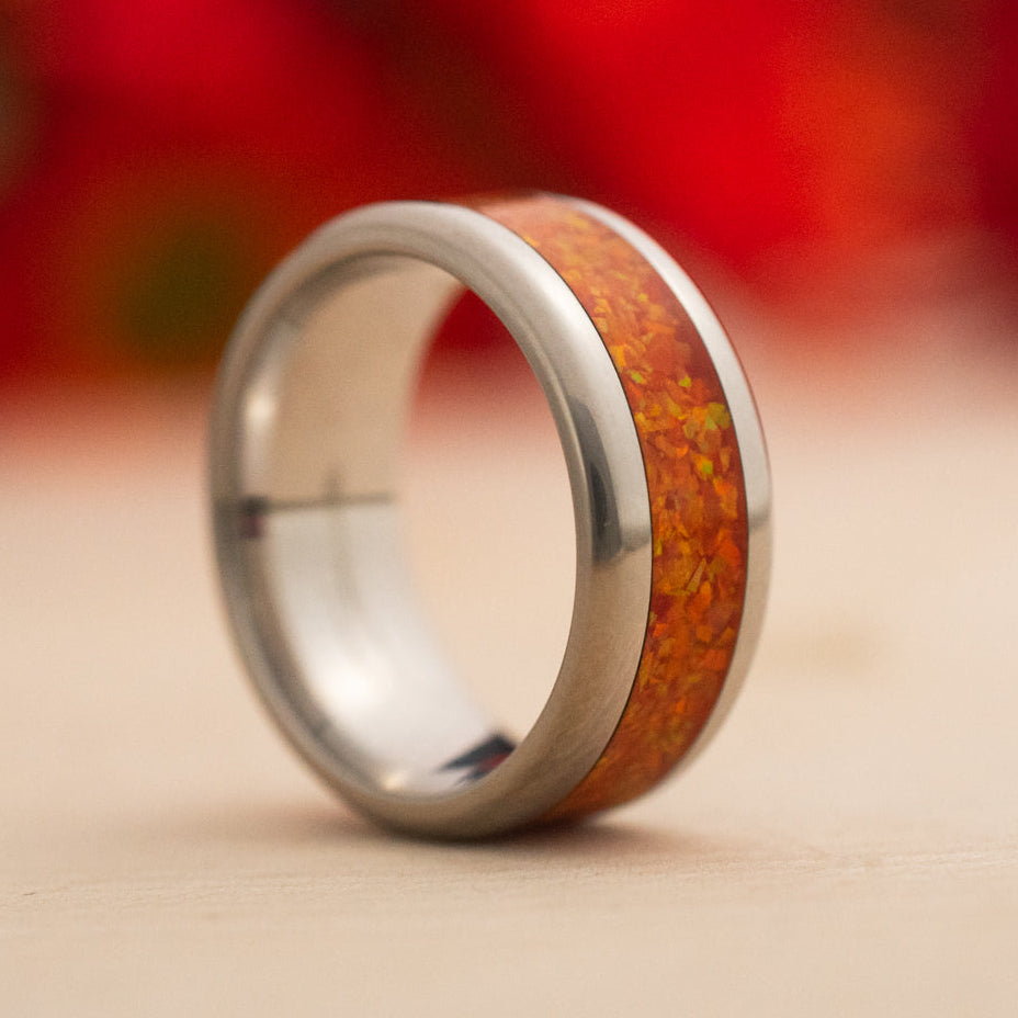 Ignition blazes with a warm, golden-orange opal inlay that flickers with hints of scarlet and sun-yellow. It radiates with the color of celebration—bonfires, sunrises, and autumn leaves in full blaze. This is a ring for those who bring light wherever they go.