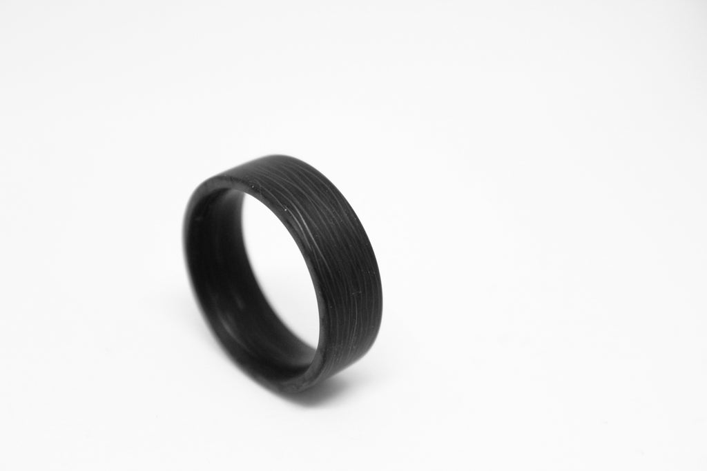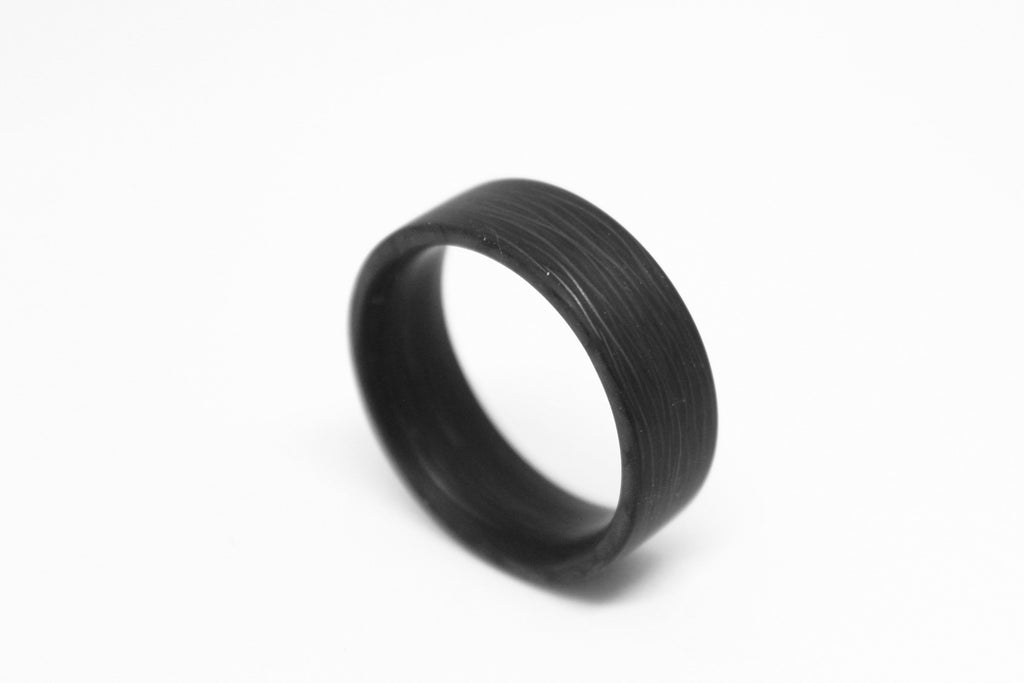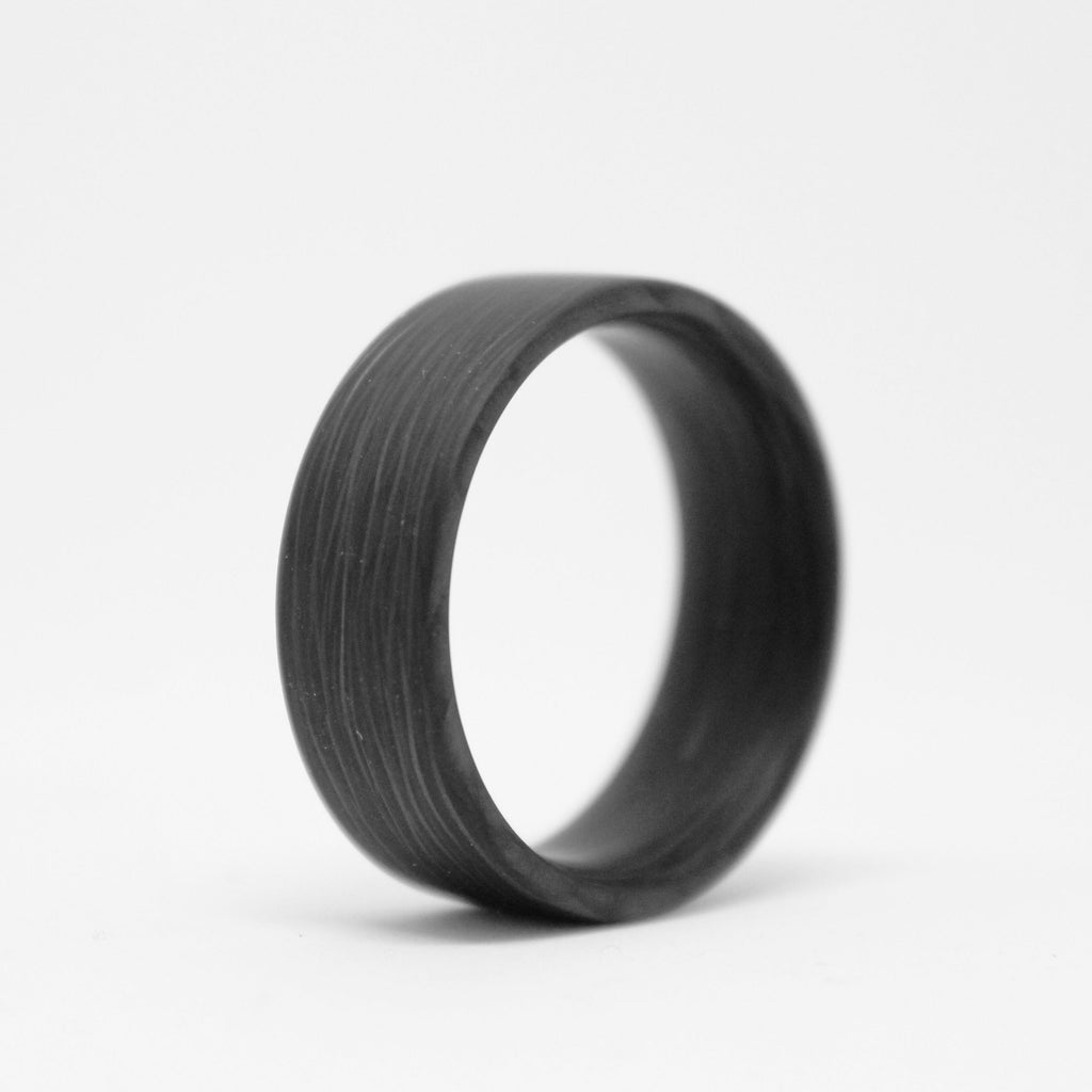 Aerospace engineering drives technology and material development that inspired this design. It's an ultra lightweight, strong ring that is a great daily wear. This particular style is made from a solid block of carbon fiber. It is cross cut to expose beautiful waves from the side view of multiple layers of 2x2 twill weave.