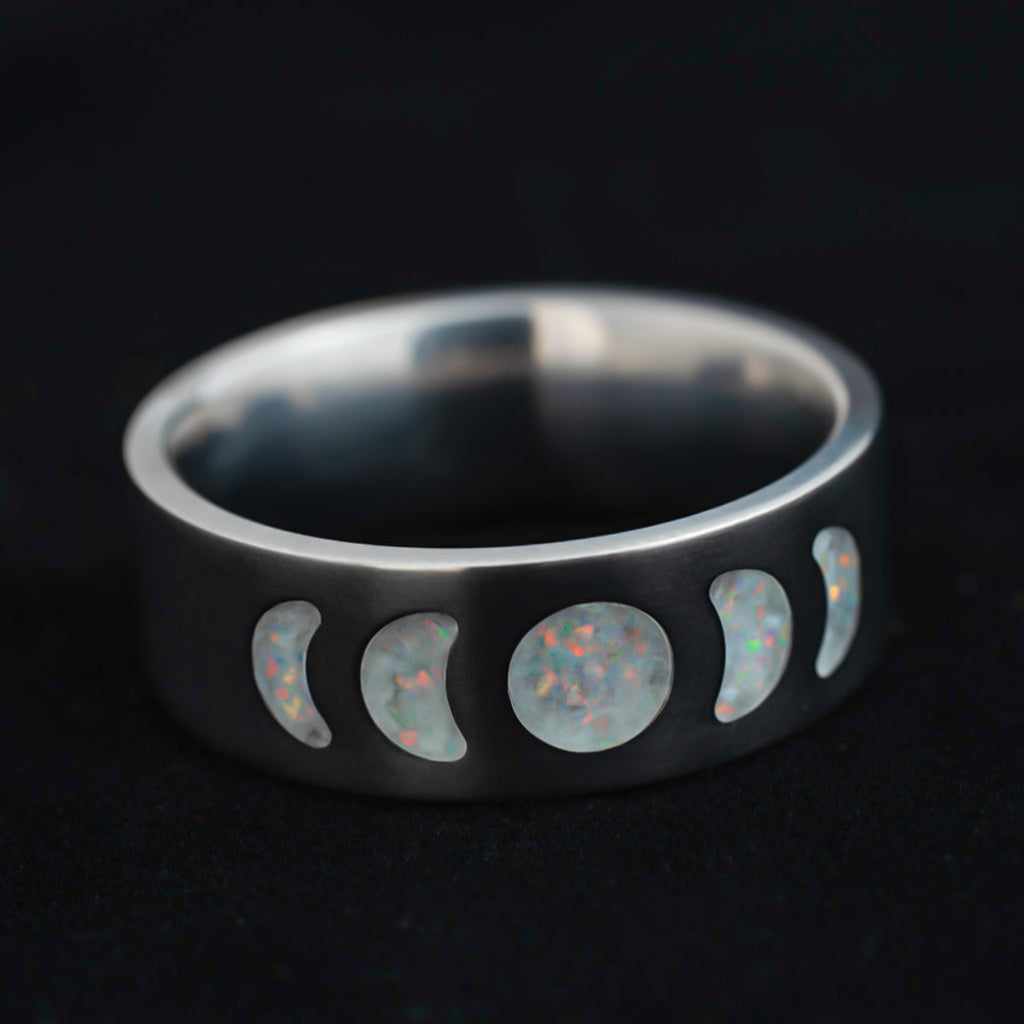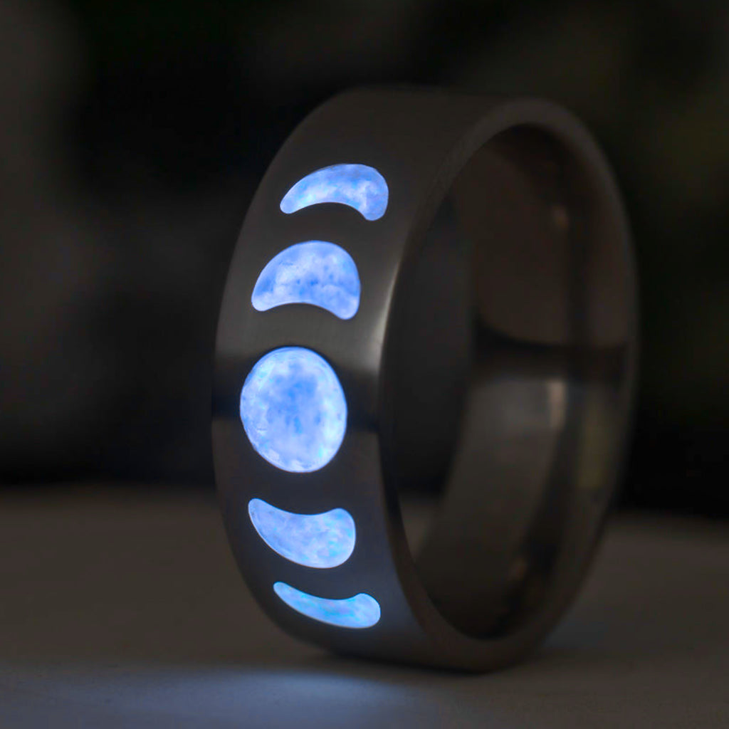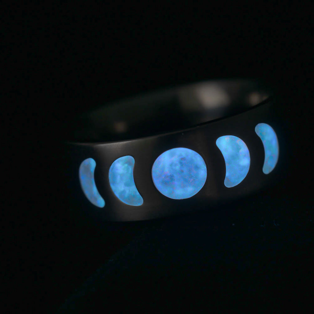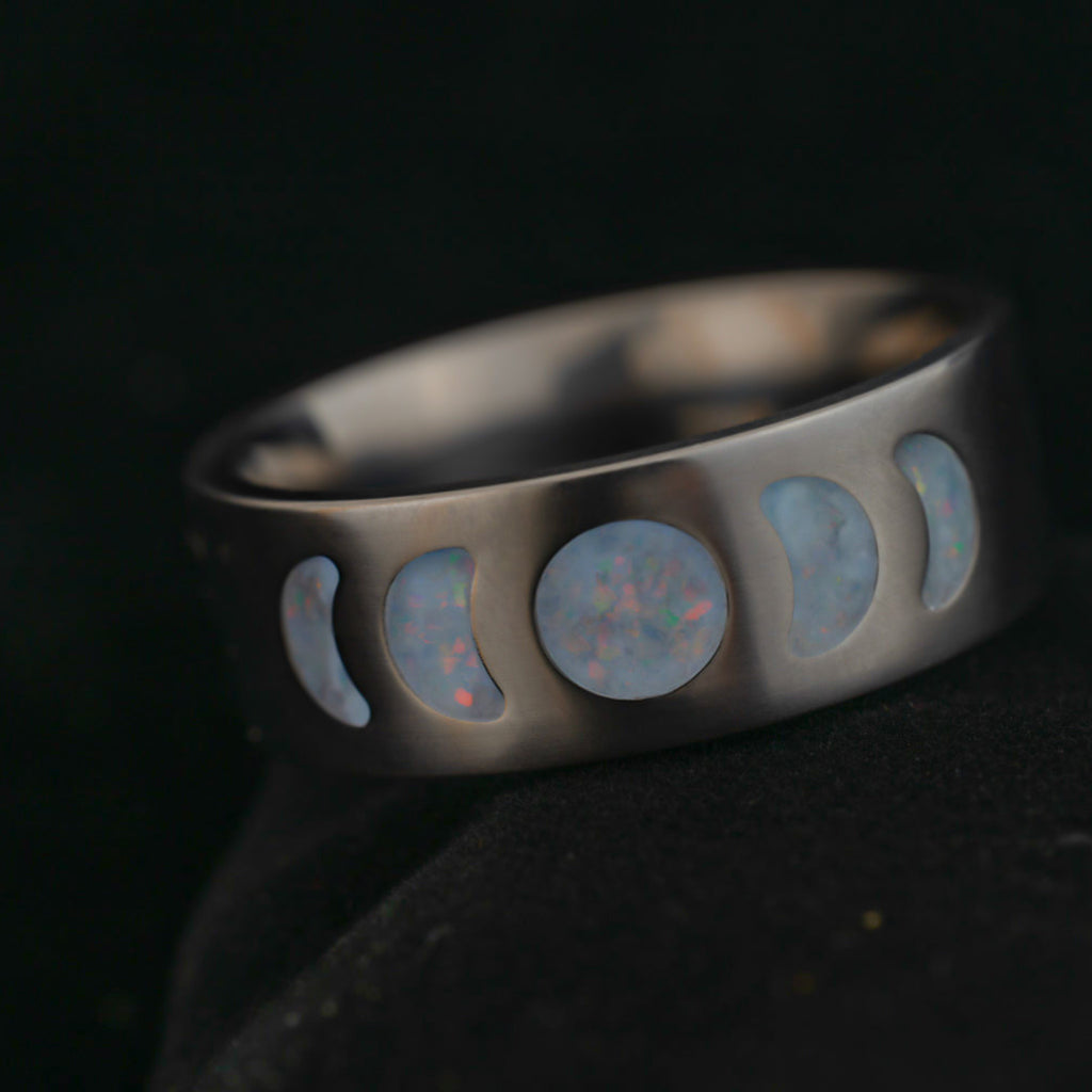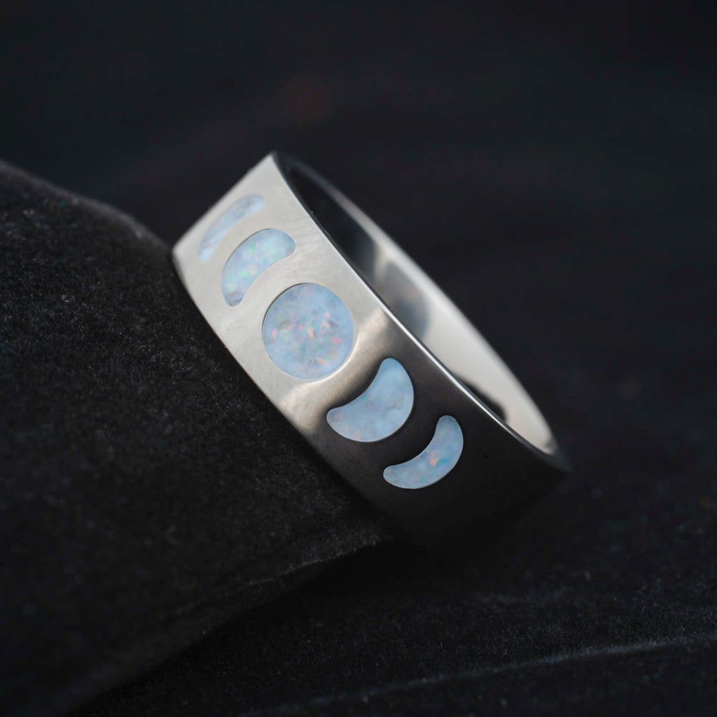 The Frost Moonphase ring captures the pale glow of winter moons, etched in titanium and inlaid with opal that flashes with icy blues, soft white, and glints of ember. Under daylight, it shimmers like snow beneath stars. In the dark, it glows with a crisp arctic blue—like moonlight on fresh powder.