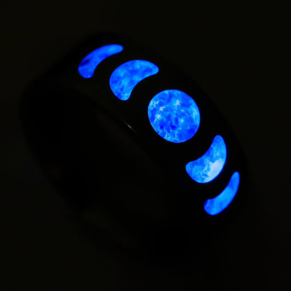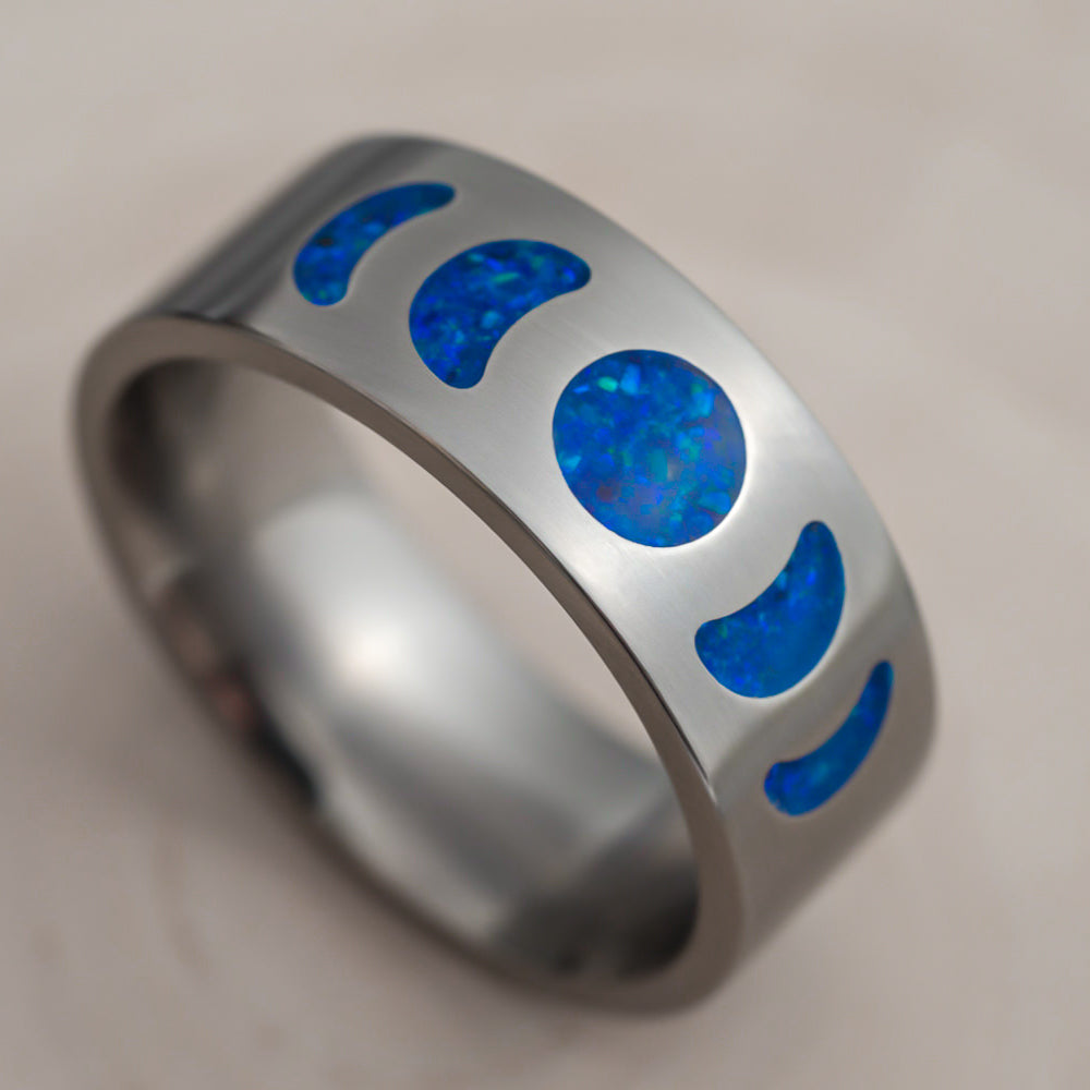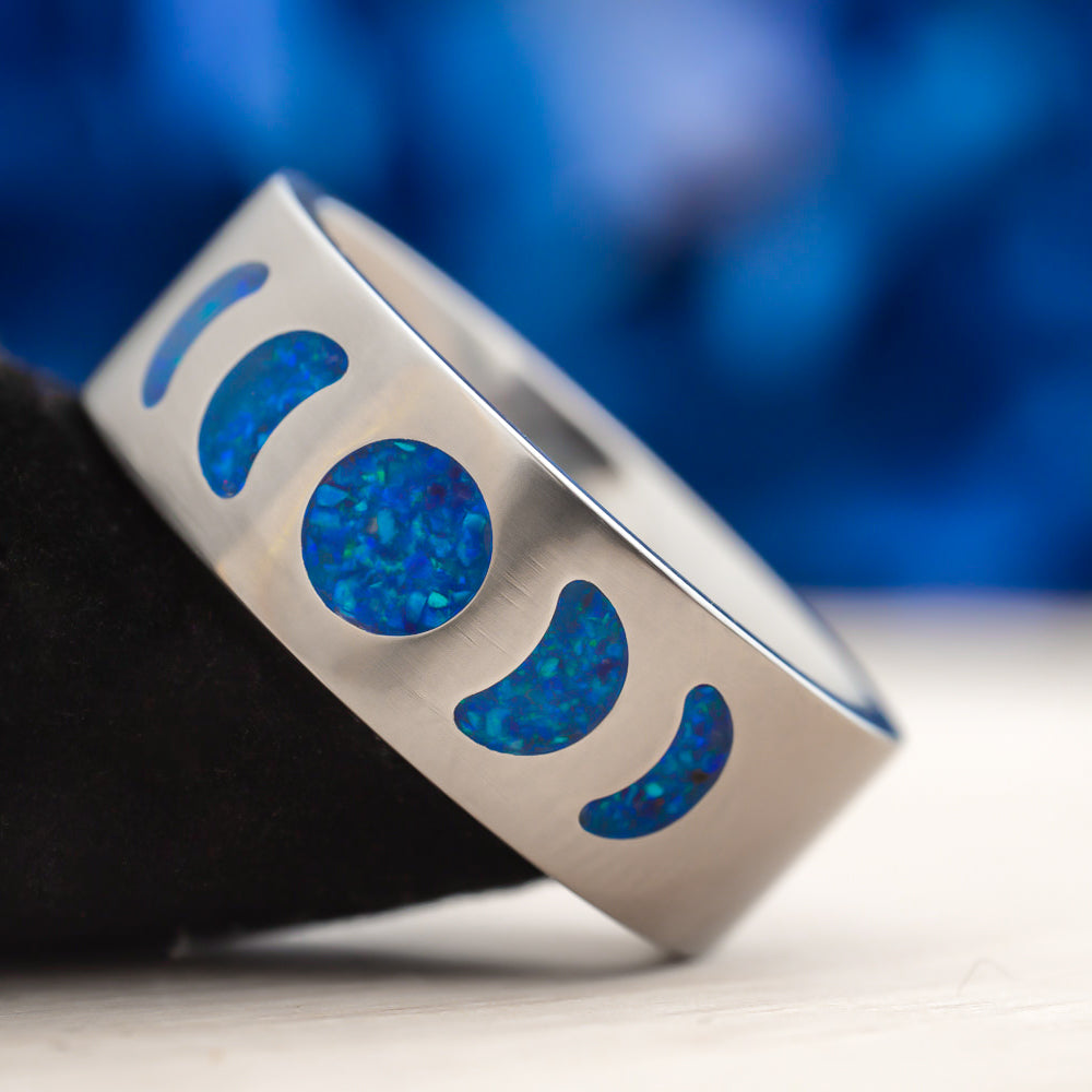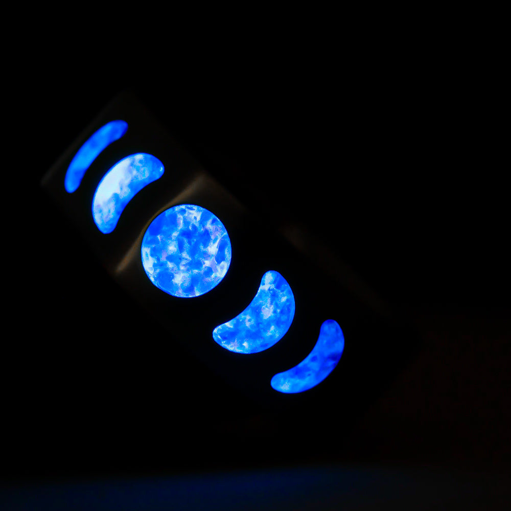 The Nereus Moonphase ring captures lunar magic in motion, etched with each phase of the moon and filled with deep ultramarine opal that glimmers like a restless sea under starlight. By day, it reflects oceanic blues; by night, it comes alive—glowing electric blue in the dark. It’s a tribute to cycles, mystery, and the balance between stillness and surge.
