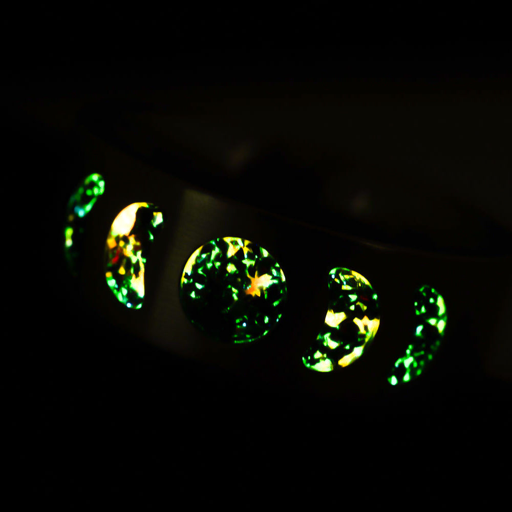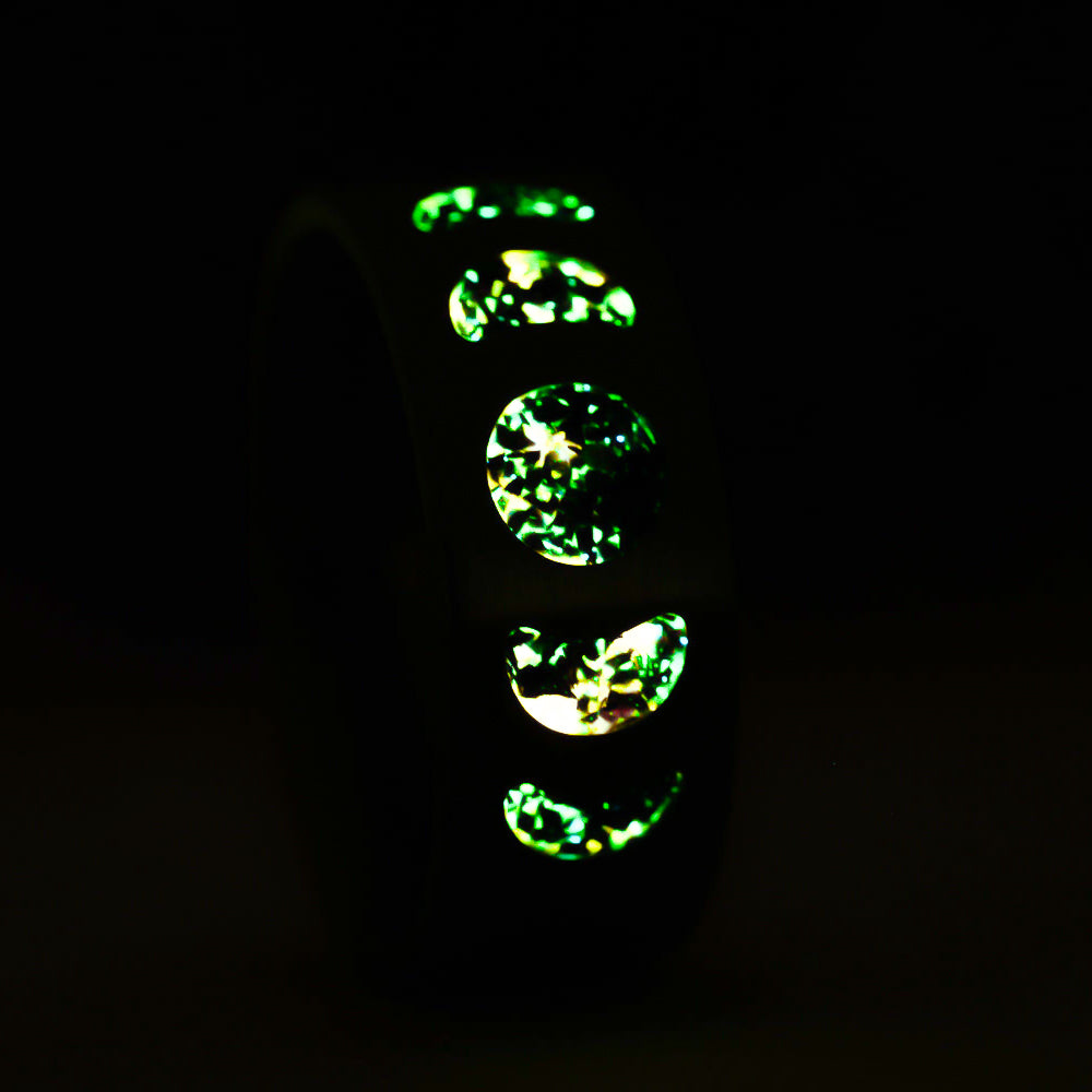 The brushed silver finish offers a stark backdrop to the dark, glowing moons—clean, strong, and quietly intense. Made to endure, made to illuminate, this ring carries both shadow and flame in every phase.